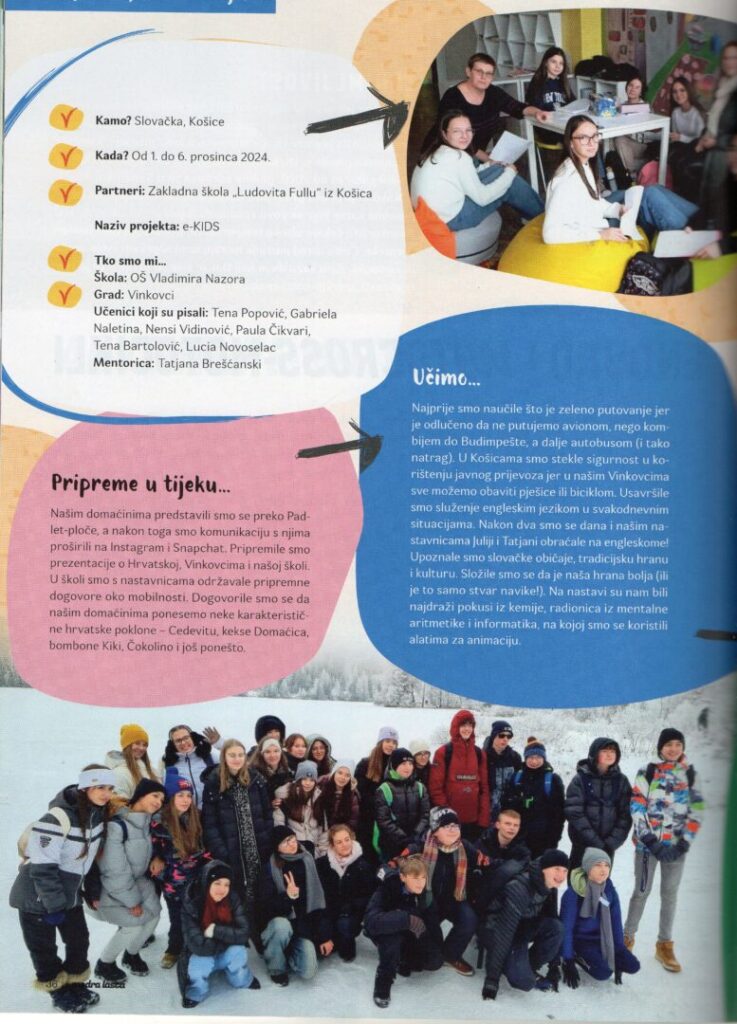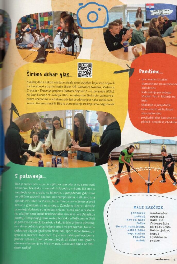 Dok je prva mobilnost učenika u okviru Erasmus akreditacije u ovoj školskoj godini u završnim pripremama jer se pet osmaša sprema na skori put u njemački Bobingen, prisjećamo se mobilnosti iz prošle školske godine u Slovačku. U 3. broju Modre laste – časopisa za mlade uz koji su odrastale mnoge generacije, u rubrici ERA(SMUS) PUTOVANJA na dvije stranice obljavljen je prilog upravo o putovanju u Košice!