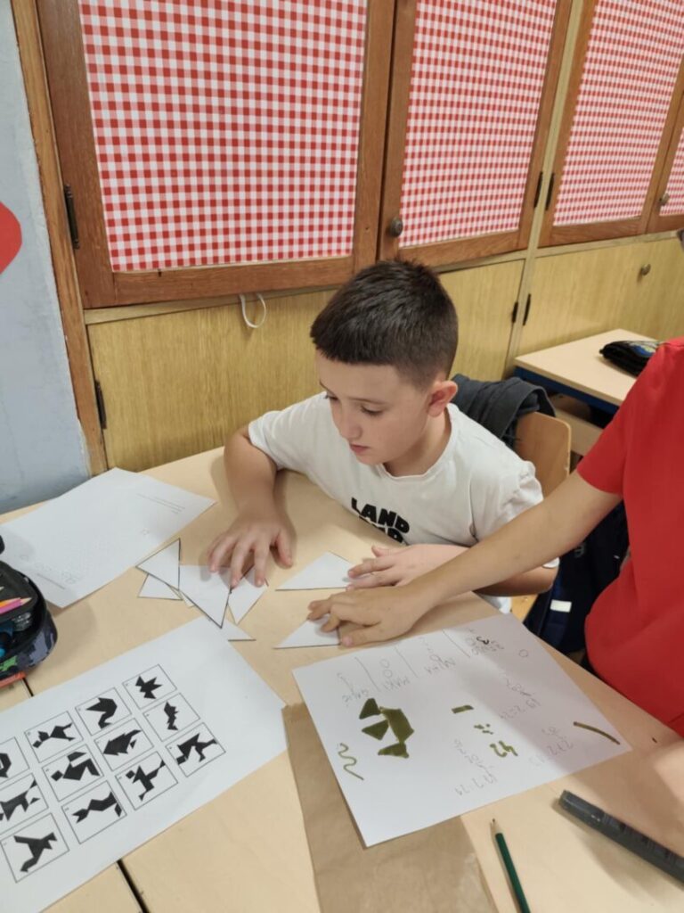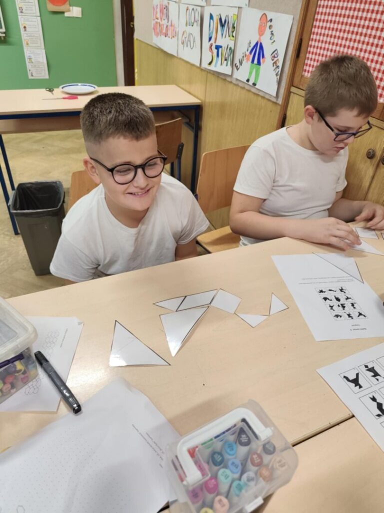 Djeca su s velikim uzbuđenjem prelazila iz centra u centar. Negdje su slagali tangrame, pokušavajući od različitih geometrijskih likova stvoriti poznate i zadane slike.